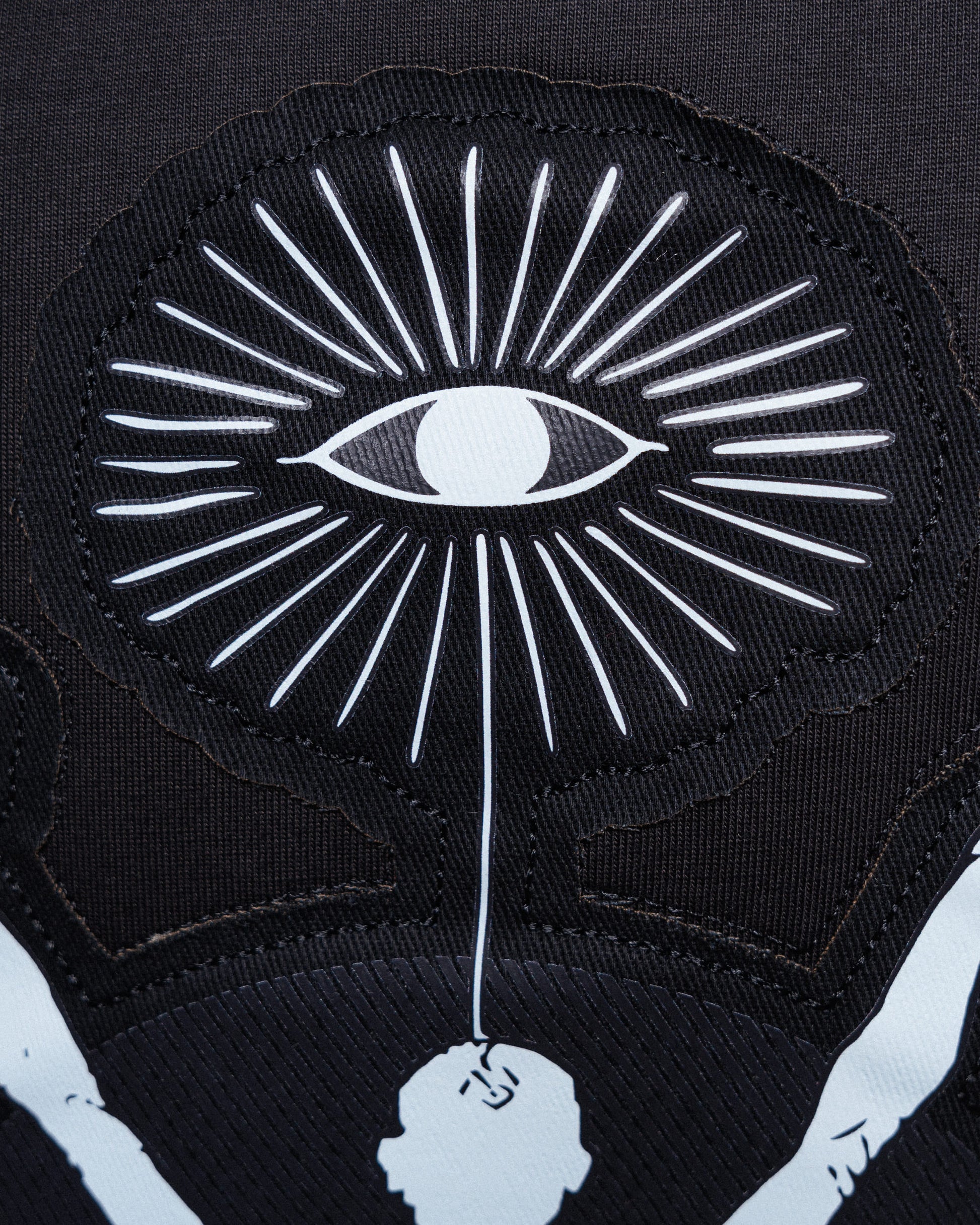 • Espalda con diseño bordado en alta definición: figura mística con múltiples brazos proyectando hacia un ojo astral, símbolo del “todo lo ve”.