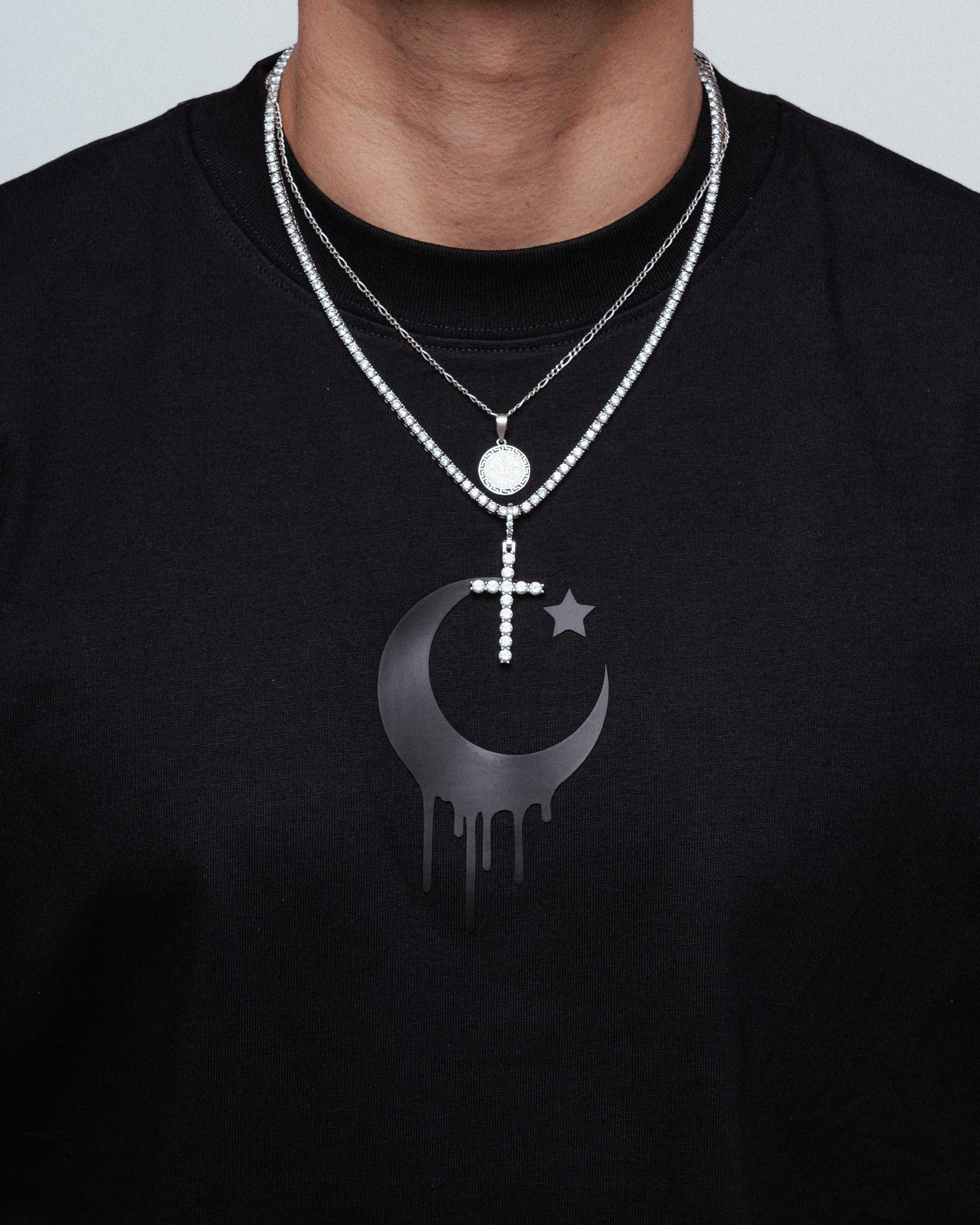 • Frente con estampado en vinil 3D: luna creciente con estrella, en un acabado negro brillante sobre negro mate, creando un contraste sutil pero poderoso.